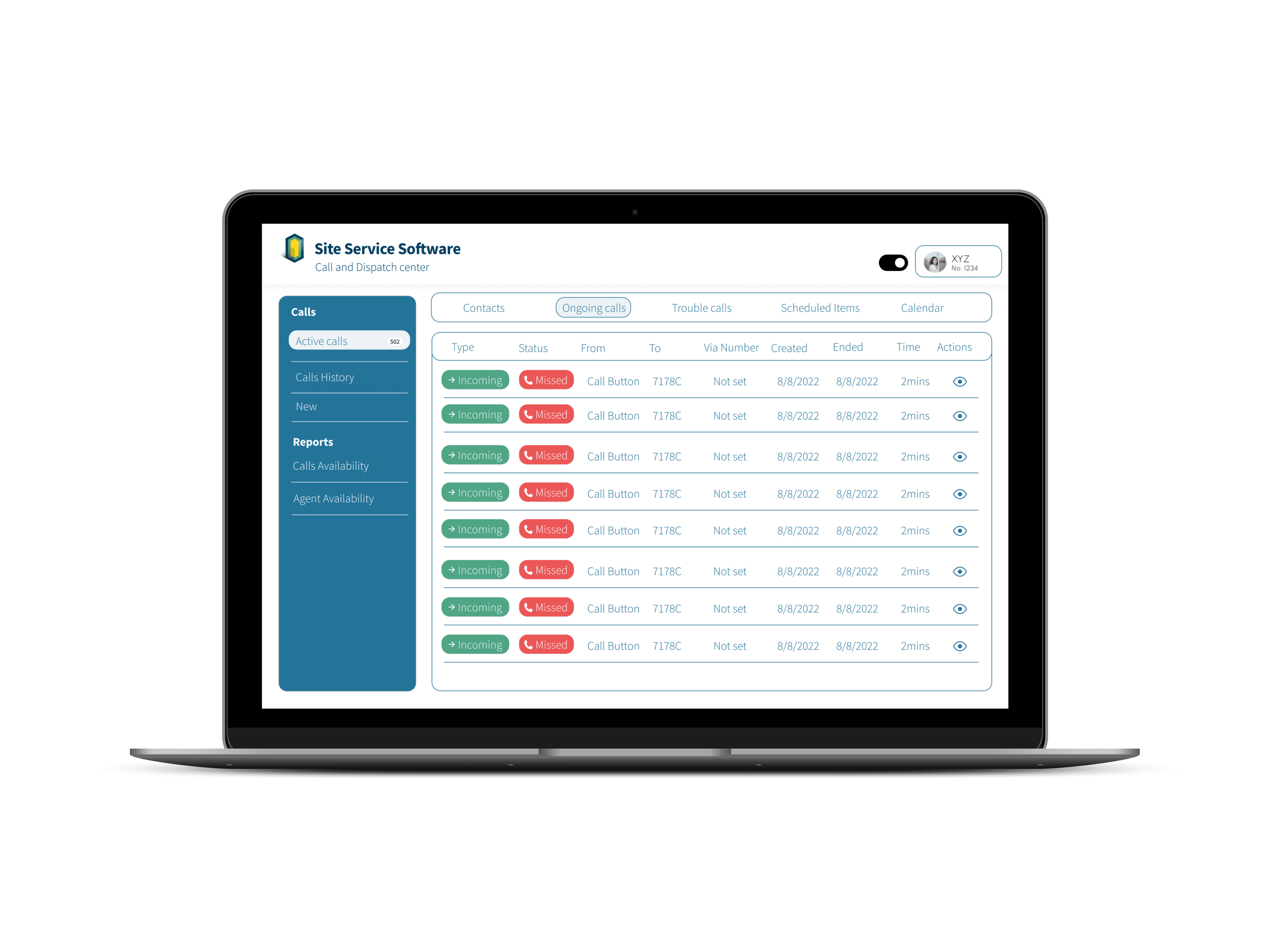 The interface organizes call activity into a clear, scannable table, allowing agents to track call status, timelines, and actions at a glance while reducing cognitive load during busy operations.